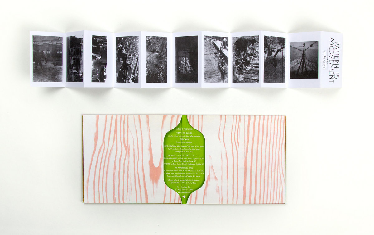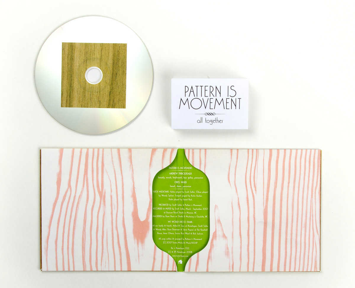 This CD is beautiful. Printed in Portland, OR by Stumptown Printers, the wallet features the "All Together" woodgrain motif, plus die-cut inner pockets that reveal the bright green spot-color interior of the package. The collection of photographs that inspired the songs on the album were reproduced in a strip of perforated(!) pictures. That's right: you can tear them apart and create your own collection. Of course, the CD face was printed in CMYK.